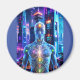 A glowing human form stands against a backdrop of futuristic skyscrapers, with vibrant colours and energy points illuminating various parts of the body. The high-tech cityscape reflects neon lights, creating a dynamic and energetic atmosphere.