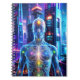 A glowing human form stands against a backdrop of futuristic skyscrapers, with vibrant colours and energy points illuminating various parts of the body. The high-tech cityscape reflects neon lights, creating a dynamic and energetic atmosphere.