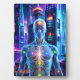 A glowing human form stands against a backdrop of futuristic skyscrapers, with vibrant colours and energy points illuminating various parts of the body. The high-tech cityscape reflects neon lights, creating a dynamic and energetic atmosphere.