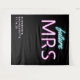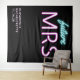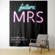 Cool modern "future Mrs" personalised black photo booth tapestry for your bachelorette party, with "future" and "MRS" written in teal blue and hot pink scripts with a neon lights effect. You can personalise with your name and party date. The bottom corner is left blank for an area for your guests to take photos.