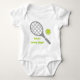Tennis racket and ball baby body suit that showcases a grey racket, a green tennis ball and your text on white background with green border. The perfect gift for the future tennis player or tennis lover in your life. Some elements courtesy of vectorportal.com.