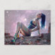 This futuristic woman is in a desolate area wearing a metallic outfit and shoes