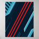 A digital abstract artwork featuring bold diagonal lines and geometric patterns in dark blue, cyan, red, and white. The design combines sharp angles with parallel stripes, creating a sleek, modern, and futuristic visual style.
