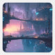Futuristic cityscape with towering structures and interconnected platforms, reflecting in a body of water. The colour palette is dominated by blues and purples, with hints of orange and pink from the setting sun. The city is illuminated with numerous lights, creating a vibrant and dynamic atmosphere.
