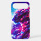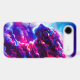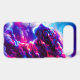 A powerful cosmic leopard emerging from vibrant clouds of neon pink, electric blue, and deep violet.