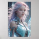 A futuristic female android with flowing pastel hair gazes softly into the distance, exuding a serene and ethereal presence. Her metallic armour blends seamlessly with organic features, creating a harmonious fusion of technology and humanity.