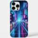 futuristic neon cityscape, streets illuminated with bright blue and purple lights in cyberpunk style, holographic signs, minimalist and stylish design, vertical format