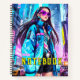 Futuristic anime-style pop star stands in the centre of a cyberpunk city. She wears an oversized, high-tech light blue jacket with bold geometric patterns, pink sunglasses, and futuristic accessories. Perfect design for teenagers