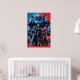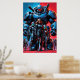 A group of sci-fi soldiers in advanced armour stand before a colossal blue robot in a futuristic cityscape with a red and blue split background. Clear details and vibrant colours enhance visual appeal.