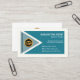 Card features a Cyan colored triangle and polygon design. Over at the top lies your prestigious name and job title alongside a slogan option near the center. Towards the base are the contact details housed by triangle buttons. A gold logo and its business name is attached to the triangle on the left face.