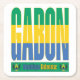 The national flag of Gabon is infused into the name of the country. Underneath that image is the country name as it is known nationally, and at either side of the name are two national coat of arms.