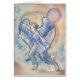 Gabriel, with short dark hair and large blue wings, holds a sword in a fighting stance, wearing modern city clothes, snowflakes drifting down around her in an urban winter scene, with a large city in the distance. The large moon is behind her. Swils of blue and warm grey dominate the painting. Watercolor and ink pen painting on hot press watercolor paper, from my archangel series, which includes Gabriel, St Michael, Raphael, and Uriel.