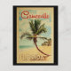 A uniquely retro mid-century modern Gainesville Florida art print in vintage travel poster style. It features a curved palm tree on sandy beach with ocean under a blue cloudy sky.