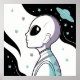 This illustration features a stylized alien head and torso in profile, gazing towards the upper right. The alien has a light grey head with prominent black, almond-shaped eyes, and a light purple hue on the back of its head and neck. Its body is depicted with geometric patterns in light blue and purple. The background is a stark contrast of black and white, adorned with various stars and a stylized, ringed planet in light blue. The artwork creates a sense of cosmic wonder and an intriguing, calm alien presence.