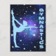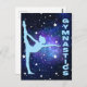 Galaxy Gymnastics design with white stars, milky way, light powder blue female gymnast silhouette and says gymnastics in vertical form.