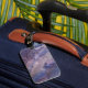 Luggage tag with blue and purple galaxy with scattered white stars. Original artwork by Ray Bean is watercolor on watercolor paper.