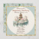 A pretty teacup, piece of cake and vase of pink roses complete the pretty invitation encircled in a gold colour round frame.