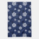 Modern navy blue and white nautical ship's wheel patterned towel, perfect for the galley kitchen. Big white ship's wheels patterned over a background of circles, in deep blue colours.