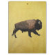 A digital painting of the American bison, or buffalo,  superimposed on a brain-tan leather background image. The bison (Bison bison), the largest land mammal in North America, is considered a keystone species: they once roamed the continent in great herds, and their grazing pressure helped shape the ecology of the Great Plains. Two subspecies or ecotypes have been described: the plains bison (Bison bison bison), smaller in size and with a more rounded hump, and the wood bison (Bison bison athabascae) – the larger of the two and having a taller, square hump. The  bison is a relative newcomer to North America, having originated in Eurasia and migrated over the Bering Strait About 10,000 years ago it replaced the steppe bison (Bison priscus), a previous immigrant that was much larger. It is thought that the steppe bison became extinct due to a changing ecosystem and hunting pressure following the development of the Clovis point and related technology, and improved hunting skills. During this same period, other megafauna vanished and were replaced to some degree by immigrant Eurasian animals that were better adapted to predatory humans. The extant bison, technically a dwarf form, was one of these animals. There were once an estimated  20-30 million bison, also referred to as buffalo, roaming North America. Their range once roughly comprised a triangle between the Great Bear Lake in Canada's far northwest, south to the Mexican states of Durango and Nuevo León, and east along the western boundary of the Appalachian Mountains. The first thoroughfares of North America, except for the time-obliterated paths of mastodon or musko, were the traces made by bison and deer in seasonal migration and between feeding grounds and salt licks. Many of these routes, hammered by countless hoofs instinctively following watersheds and the crests of ridges in avoidance of lower places' summer muck and winter snowdrifts, were followed by Native Americans and were invaluable to explorers.. The term "buffalo" may be considered a misnomer for this animal, as it is only distantly related to either of the two "true buffalo," the Asian water buffalo and the African buffalo. However, "bison" is a Greek word meaning ox-like animal, while "buffalo" originated with the French fur trappers who called these massive beasts bœufs, meaning ox or bullock – so both names, "bison" and "buffalo," have a similar meaning. In reference to this animal, the term "buffalo," which dates to 1635, has a much longer history than the term "bison," which was first recorded in 1774.The American bison is more closely related to the wisent or European bison. Unregulated shooting of bison, which culminated in mass slaughters during the 1870s, reduced the population to 1,091 in 1889. Today, approximately 500,000 bison live across North America. Most are not pure bison but rather have been cross-bred with cattle in the past and are raised as livestock on ranches. Fewer than 30,000 bison are in conservation herds, and fewer than 5,000 are free-ranging and disease-free. Today bison are ecologically extinct throughout most of their historic range, except for a few national parks and other small wildlife areas. Yellowstone National Park has the largest population of free-roaming plains bison (about 4,000), and Wood Buffalo National Park has the largest population of free-roaming wood bison (about 10,000). A bison has a shaggy, long, dark brown winter coat, and a lighter weight, lighter brown summer coat. The winter coat is so thick and well insulated that snow can cover its backs without melting. Male bison are slightly larger than females. Plains bison typically weigh  from 700 to 2,200 lbs. The heaviest wild bull ever recorded weighed 2,800 lbs. When raised in captivity and farmed for meat, the bison can grow unnaturally heavy and the largest semi-domestic bison weighed 3,800 lbs. The heads and forequarters are massive, and both sexes have short, curved horns that can grow up to 2 feet  long, which they use in fighting for status within the herd and for defence. Bison are herbivores, grazing on the grasses and sedges of the North American prairies. Their daily schedule involves two-hour periods of grazing, resting and cud chewing, then moving to a new location to graze again. This regular motion ensures that bison seldom overgraze an area.  Bison often rub and roll on the ground creating shallow, saucer-like depressions called wallows.  Bison roll in wallow, wet or dry, covering themselves with dust or mud. Past explanations and current hypotheses suggested for wallowing behaviour include grooming behaviour associated with shedding, male-male interaction (typically rutting behaviour), social behaviour for group cohesion, play behaviour, relief from skin irritation due to biting insects; reduction of ticks and lice; and thermoregulation. Wallows were once a common feature of the plains. In winter, bison can dig through deep snow with their heads to reach the vegetation below. Bison have poor eyesight, but have acute hearing and an excellent sense of smell. Bison can reach speeds of up to 35 mph. Bison have a life expectancy of approximately 15 years in the wild and up to 25 years in captivity. Bison mate in late spring and summer in more open plain areas. During fall and winter, bison tend to gather in more wooded areas. During this time, bison partake in horning behaviours. They will rub their horns against trees, young saplings and even telephone poles. Aromatic trees like cedars and pine seem to be preferred. Horning appears to be associated with insect defence as it occurs most often in the fall when the insect population is at its highest. Cedar and pines emit an aroma after bison horn them and this seems to be used as a deterrent for insects. While often secure from predation due to their size and strength, in some areas, bison are regularly predated by wolves. Wolf predation typically peaks in late spring and early summer, with attacks usua