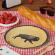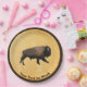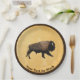 A galloping bison is painted on the skin side of a beaver pelt stretched on a willow hoop. Everything is superimposed on an old paper, or parchment, background image. Customise by adding your own text.