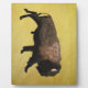 A digital painting of the American bison, or buffalo, superimposed on a brain-tan leather background image. The bison (Bison bison), the largest land mammal in North America, is considered a keystone species: they once roamed the continent in great herds, and their grazing pressure helped shape the ecology of the Great Plains. Two subspecies or ecotypes have been described: the plains bison (Bison bison bison), smaller in size and with a more rounded hump, and the wood bison (Bison bison athabascae) – the larger of the two and having a taller, square hump. The bison is a relative newcomer to North America, having originated in Eurasia and migrated over the Bering Strait About 10,000 years ago it replaced the steppe bison (Bison priscus), a previous immigrant that was much larger. It is thought that the steppe bison became extinct due to a changing ecosystem and hunting pressure following the development of the Clovis point and related technology, and improved hunting skills. During this same period, other megafauna vanished and were replaced to some degree by immigrant Eurasian animals that were better adapted to predatory humans. The extant bison, technically a dwarf form, was one of these animals. There were once an estimated 20-30 million bison, also referred to as buffalo, roaming North America. Their range once roughly comprised a triangle between the Great Bear Lake in Canada's far northwest, south to the Mexican states of Durango and Nuevo León, and east along the western boundary of the Appalachian Mountains. The first thoroughfares of North America, except for the time-obliterated paths of mastodon or musko, were the traces made by bison and deer in seasonal migration and between feeding grounds and salt licks. Many of these routes, hammered by countless hoofs instinctively following watersheds and the crests of ridges in avoidance of lower places' summer muck and winter snowdrifts, were followed by Native Americans and were invaluable to explorers.. The term "buffalo" may be considered a misnomer for this animal, as it is only distantly related to either of the two "true buffalo," the Asian water buffalo and the African buffalo. However, "bison" is a Greek word meaning ox-like animal, while "buffalo" originated with the French fur trappers who called these massive beasts bœufs, meaning ox or bullock – so both names, "bison" and "buffalo," have a similar meaning. In reference to this animal, the term "buffalo," which dates to 1635, has a much longer history than the term "bison," which was first recorded in 1774.The American bison is more closely related to the wisent or European bison. Unregulated shooting of bison, which culminated in mass slaughters during the 1870s, reduced the population to 1,091 in 1889. Today, approximately 500,000 bison live across North America. Most are not pure bison but rather have been cross-bred with cattle in the past and are raised as livestock on ranches. Fewer than 30,000 bison are in conservation herds, and fewer than 5,000 are free-ranging and disease-free. Today bison are ecologically extinct throughout most of their historic range, except for a few national parks and other small wildlife areas. Yellowstone National Park has the largest population of free-roaming plains bison (about 4,000), and Wood Buffalo National Park has the largest population of free-roaming wood bison (about 10,000). A bison has a shaggy, long, dark brown winter coat, and a lighter weight, lighter brown summer coat. The winter coat is so thick and well insulated that snow can cover its backs without melting. Male bison are slightly larger than females. Plains bison typically weigh from 700 to 2,200 lbs. The heaviest wild bull ever recorded weighed 2,800 lbs. When raised in captivity and farmed for meat, the bison can grow unnaturally heavy and the largest semi-domestic bison weighed 3,800 lbs. The heads and forequarters are massive, and both sexes have short, curved horns that can grow up to 2 feet long, which they use in fighting for status within the herd and for defence. Bison are herbivores, grazing on the grasses and sedges of the North American prairies. Their daily schedule involves two-hour periods of grazing, resting and cud chewing, then moving to a new location to graze again. This regular motion ensures that bison seldom overgraze an area. Bison often rub and roll on the ground creating shallow, saucer-like depressions called wallows. Bison roll in wallow, wet or dry, covering themselves with dust or mud. Past explanations and current hypotheses suggested for wallowing behaviour include grooming behaviour associated with shedding, male-male interaction (typically rutting behaviour), social behaviour for group cohesion, play behaviour, relief from skin irritation due to biting insects; reduction of ticks and lice; and thermoregulation. Wallows were once a common feature of the plains. In winter, bison can dig through deep snow with their heads to reach the vegetation below. Bison have poor eyesight, but have acute hearing and an excellent sense of smell. Bison can reach speeds of up to 35 mph. Bison have a life expectancy of approximately 15 years in the wild and up to 25 years in captivity. Bison mate in late spring and summer in more open plain areas. During fall and winter, bison tend to gather in more wooded areas. During this time, bison partake in horning behaviours. They will rub their horns against trees, young saplings and even telephone poles. Aromatic trees like cedars and pine seem to be preferred. Horning appears to be associated with insect defence as it occurs most often in the fall when the insect population is at its highest. Cedar and pines emit an aroma after bison horn them and this seems to be used as a deterrent for insects. While often secure from predation due to their size and strength, in some areas, bison are regularly predated by wolves. Wolf predation typically peaks in late spring and early summer, with attacks usually bei