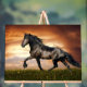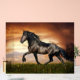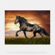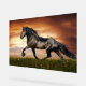 A majestic horse gallops across a field as the sun sets, casting a dramatic glow in the sky. The scene captures the beauty and energy of the horse against a backdrop of vibrant colours.