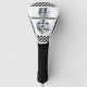 Golf club cover with black and white dice design accented by chequered black and white stripes. Shown as a cover for a driver. Design may be transferred to other types of club covers.