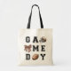 Game Day football tote bag featuring letters G A M E and D Y in a black distressed font with watercolor football illustrations of a football helmet, leather football bow and a football aligned with letters. Additional styles available.