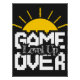 Game Over is depicted in bold, pixelated lettering, with the words “Level Up” creatively superimposed on it in an ornate script at its centre and a sun shining behind it at the top. The design combines retro gaming aesthetics with a motivational twist.