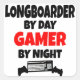This text design features the trendy phrase "Longboarder by Day Gamer by Night" and is perfect for any longboarder that loves playing computer games or video games.