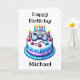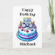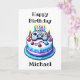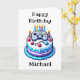 Birthday card that can be personalised with an 8-bit gaming vibe. Pixel art birthday cake with a video controller on top in blue.