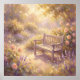 This impressionist-style painting captures a quiet garden path, where a wooden bench rests among blooming wildflowers and greenery.