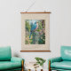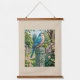 This vintage-inspired wall art features a beautifully detailed illustration of a vibrant blue and blush-coloured bird perched on an ornate, antique-style post. Surrounded by delicate pink blossoms and lush greenery, the scene evokes a serene countryside charm. The artwork is printed on a natural canvas with wooden hangers, adding to its rustic elegance. Perfect for bringing a touch of nature and timeless beauty to any space.