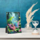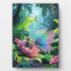 A tiny girl and a butterfly with iridescent wings perched on a giant flower in a lush jungle, accompanied by a colourful toucan. Large leaves and vibrant flowers surround them, creating a magical, whimsical scene. Digital Art