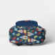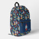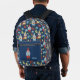 This patterned backpack has a retro modern style with illustrations of cute garden gnomes with white beards set against a navy blue background and surrounded by flowers in red, yellow and light blue on green stems. There's a spot on the front pocket to personalise this backpack with your own monogram initials in light blue lettering.