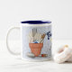 Fun Garden Guru design features a clay pot, garden tools, seed packets, dragonfly and little red ladybug. Deep blue text art says Garden Guru. Light blue floral pattern background for unique gardener gift idea.