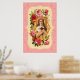 Saint Rose of Lima holds a crucifix and is surrounded by beautiful roses of pink and yellow with scrollwork. The background is patterned rose coloured and yellow brocade which compliments the colourful image.