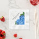 Garden romance, blue hydrangea custom paper napkins. Use this pretty, bright blue floral design for bridal showers, wedding receptions, rehearsal dinner, or any event. Customise two lines of text. Angled design on coined napkins with names and wedding date in black text.