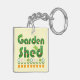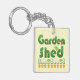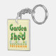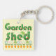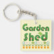 Keychain specifically to keep track of your garden shed keys with painted garden mosaic lettering, decorated with flowers and a watering can with a pale lemon background.