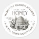 Personalise with your business name, address, and honey weight. Central illustration of a vintage skep hive in a garden surrounded by bees. Ideal for beekeepers and honey sellers. Common honey net weight conversions: 8oz (227g), 12oz (340g), 16oz (454g), 32oz (907g), 5lb (2.27kg).