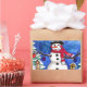 Original watercolor painting by Sandra Gale of a happy snowman in a snow covered winter garden. Great design for gardeners, kids, Moms, and anyone who likes snowmen and country garden scenes.