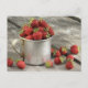 big aluminium mug full of fresh garden strawberries, stands on the old, wooden table