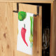 A cheerful watercolor art themed kitchen towel featuring a vibrant selection of hand painted garden vegetables on a