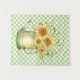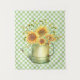 Pretty country / farmhouse design features a watercolor illustration of a garden watering can filled with a bouquet of sunflowers on mint green and white chequerboard background