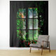Want an extra window in your home? An idyllic country garden window with green plants and some red flowers. Dark green and black backdrop.