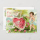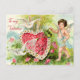 vintage painting with cupid, roses heart, and doves in a garden in colourful multi colours. colourful vintage painting with cupid with wings, blue sash and green watering can, watering a garden with big beautiful pink roses heart shaped display with a border of white daisies in a garden with trees and flora and lovely white doves flying around the pink floral heart and cupid with short brown hair, and giving refreshment to the dove and flowers. whimsical and colourful vintage valentine painting in multi colours.
