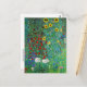 A fine art postcard with the painting by the Austrian artist Gustav Klimt (1862-1918) from (1906), Garden with Sunflowers (Bauerngarten mit Sonnenblumen). A garden landscape with red, blue and white wildflowers surrounding a large stalk of yellow sunflowers.