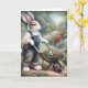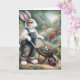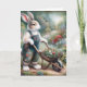 Cute white rabbit with bib overalls and a wheelbarrow in a garden.