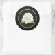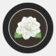 This round sticker is shown in a lovely Black and White gardenia flower print.