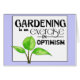 The design has a computerised drawing of a seedling in the corner, and writing in various fonts which reads 'Gardening is an exercise in optimism'.